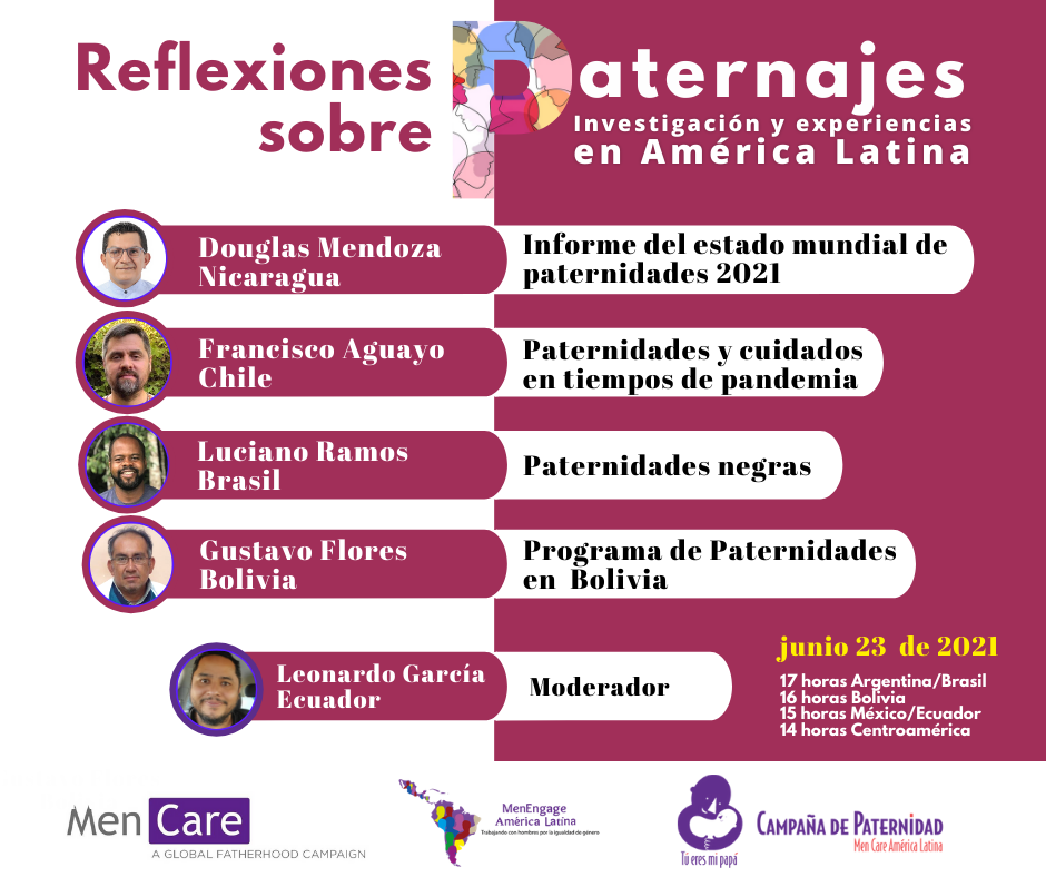 La campaña MenCare les invita al ciclo de acciones Tiempos de Paternaje en América Latina, Panel destinado a conversator sobre Reflexiones sobre paternajes: investigacoines y experiencias en América Latina.